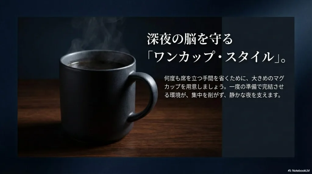何度も席を立つ手間を省き、1杯の”カップ”に夜の集中を託す。