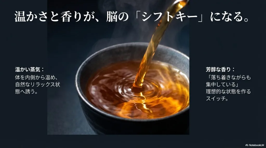 温かい蒸気で体を内側から温め、脳を自然なリラックス状態へと誘う。