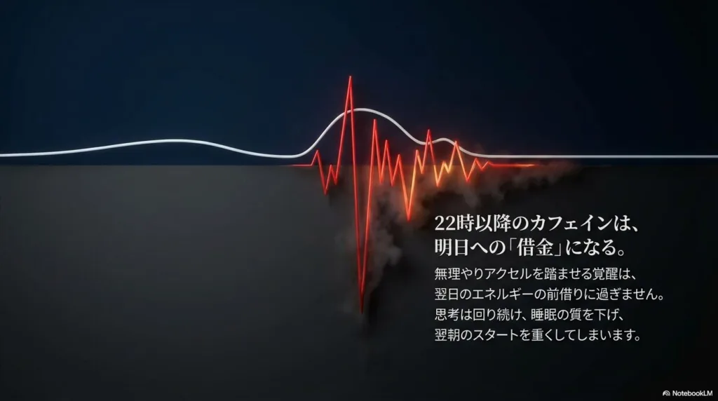 22時を過ぎてからのカフェインは、翌日の自分からエネルギーを前借りする「明日の自分への借金」になってしまいます。