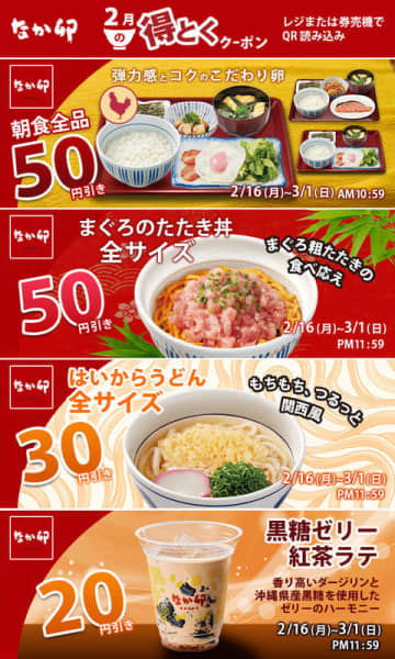 こだわり卵+海苔+京風漬物+味噌汁+ご飯の朝食が税込270円! なか卯が「2月得とくクーポン」を明日16日(月)配信~「朝食全品50円引」「まぐろ丼商品50円引」「うどん商品30円引」「黒糖ゼリー紅茶ラテ20円引」 | チバテレ+プラス – 千葉テレビ放送